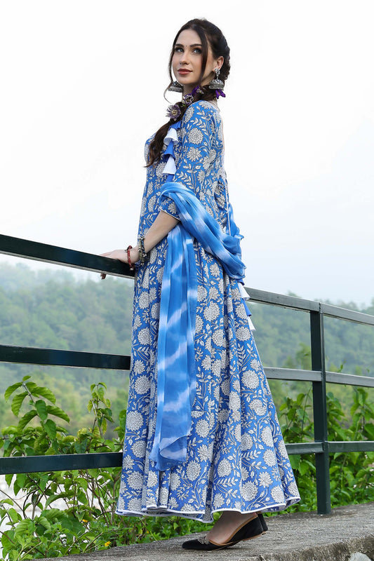 Sanganeri Kalidaar Handblock Dress With Leheriya Duppatta