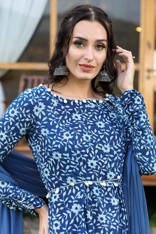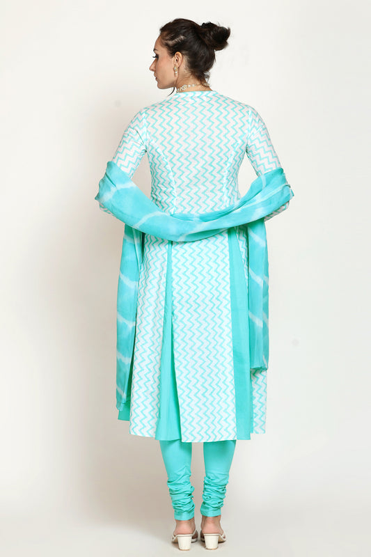 Indigo Churidar Suit Set With Chiffon Seashell Duppatta