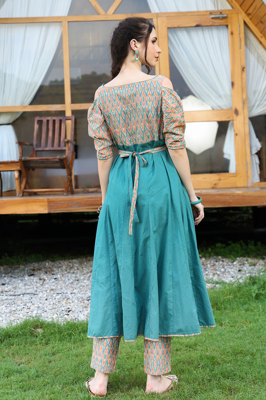 Sea Green Matka Neck Anarkali Suit Set With Leheriya Duppatta