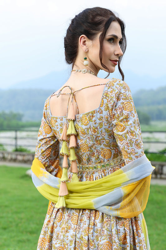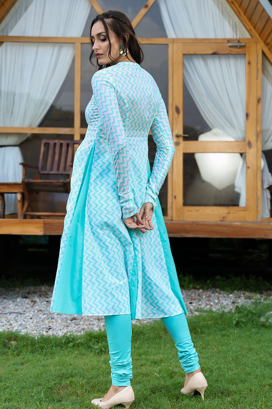 Powder Blue Handblock Mirror Embellished Anarkali Suit Set