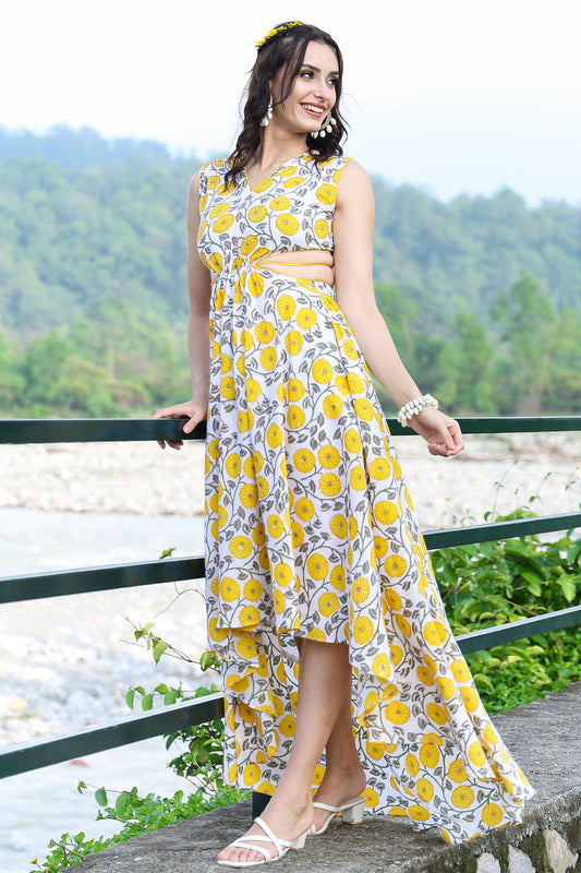 Canary Yellow Handblock Cut Out Dress With Tassels