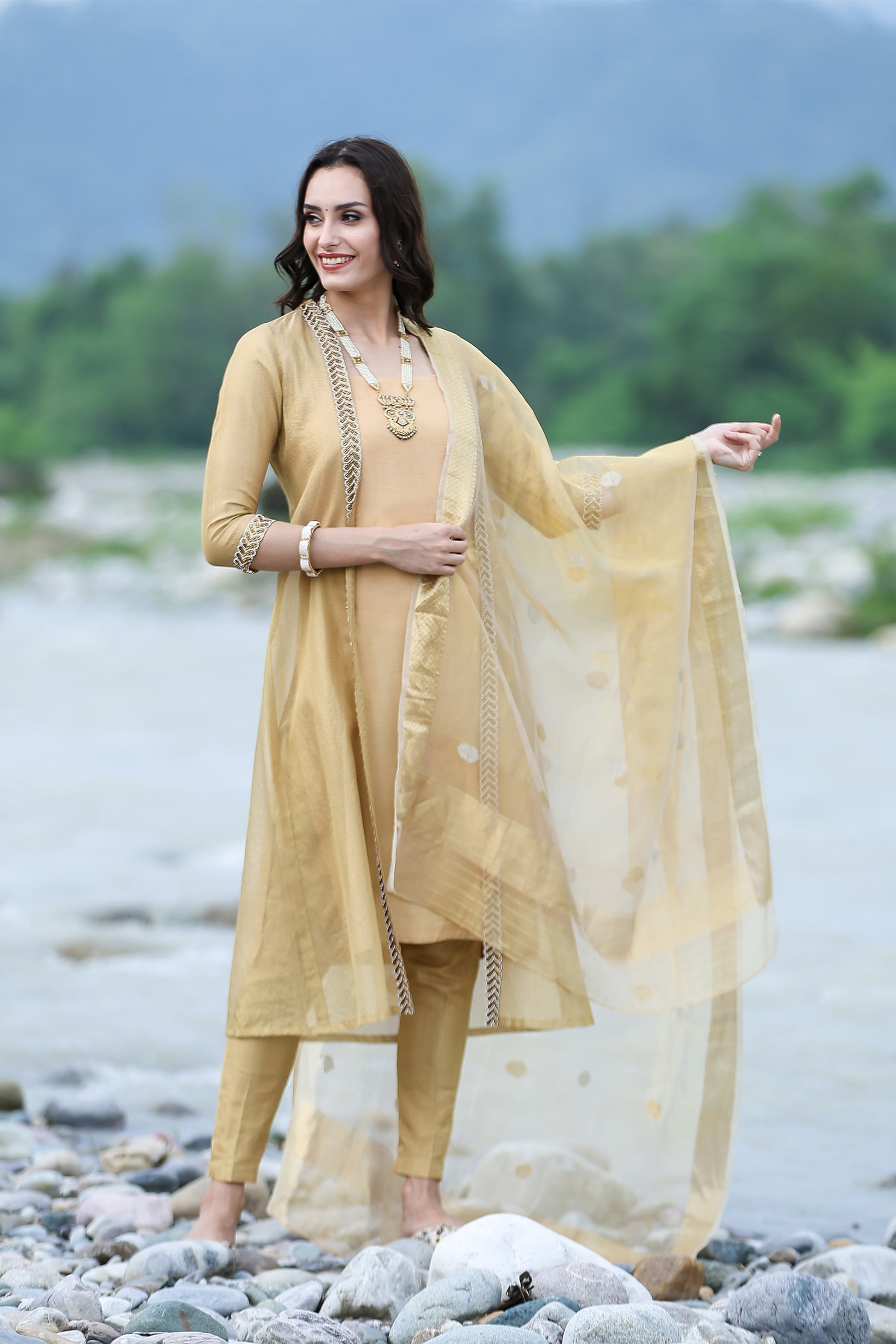 Epitome of grace, royalty and elegance featuring Banarasi Munga Handloom Silk Suit Set with zari embedded three quarter sleeved, boat neck, mulmul lined straight kurta, munga silk duppatta , and cigar mulmul lined tissue pants