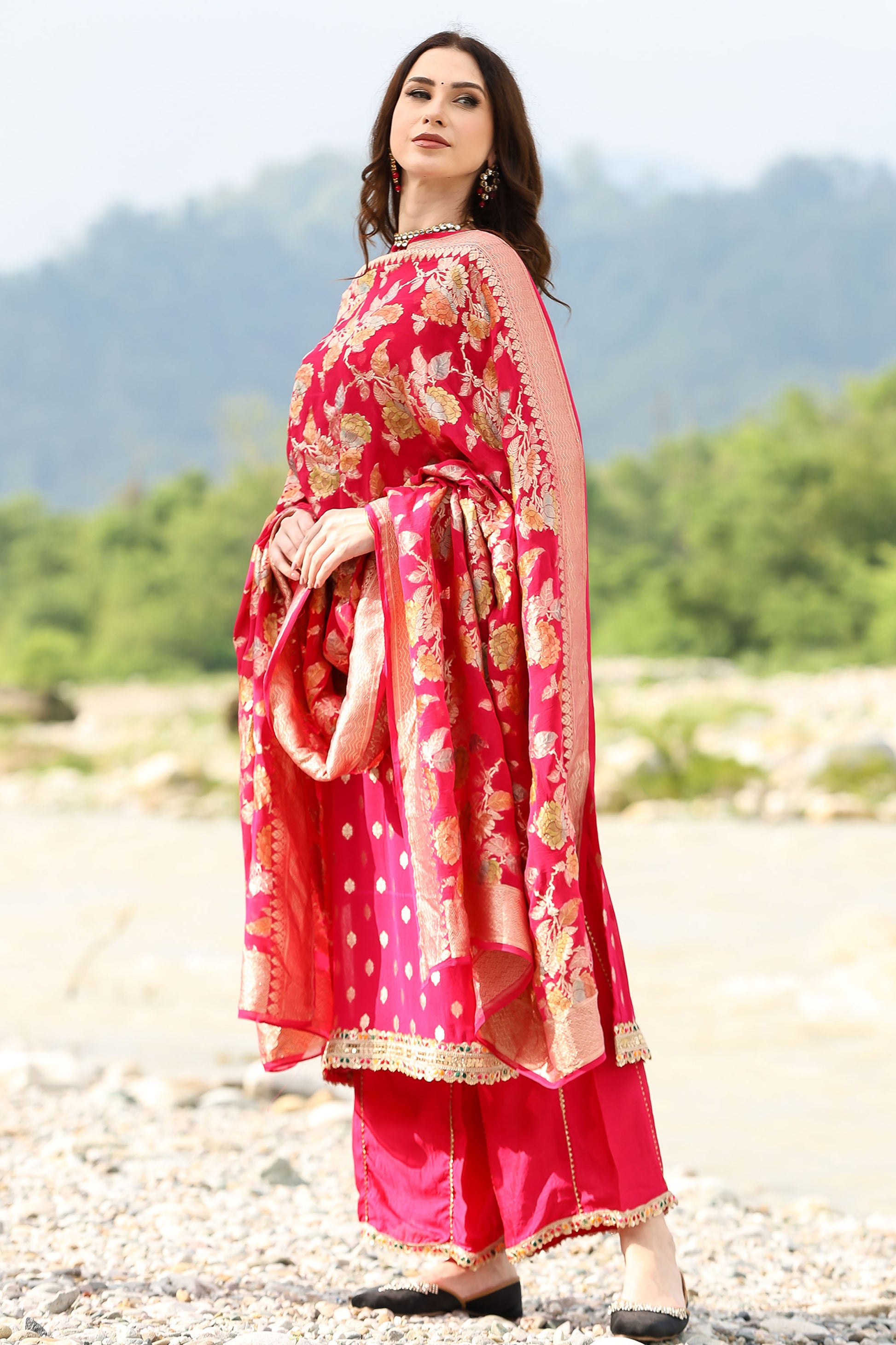 Epitome of grace , royalty and elegance featuring Handloom Banarasi Georgette Suit Set, that features star element of this suit set which is a multi coloured pink Banarasi Georgette Duppatta with heavy zari hand work by artisans, pink kurta with golden zari embedded buttis, three-quarter sleeves with embellishments on hem and sleeves and festive tassels in back, Paired with comfortable and elasticated pallazo pants in chanderi silk blend fabric with embellisments.
