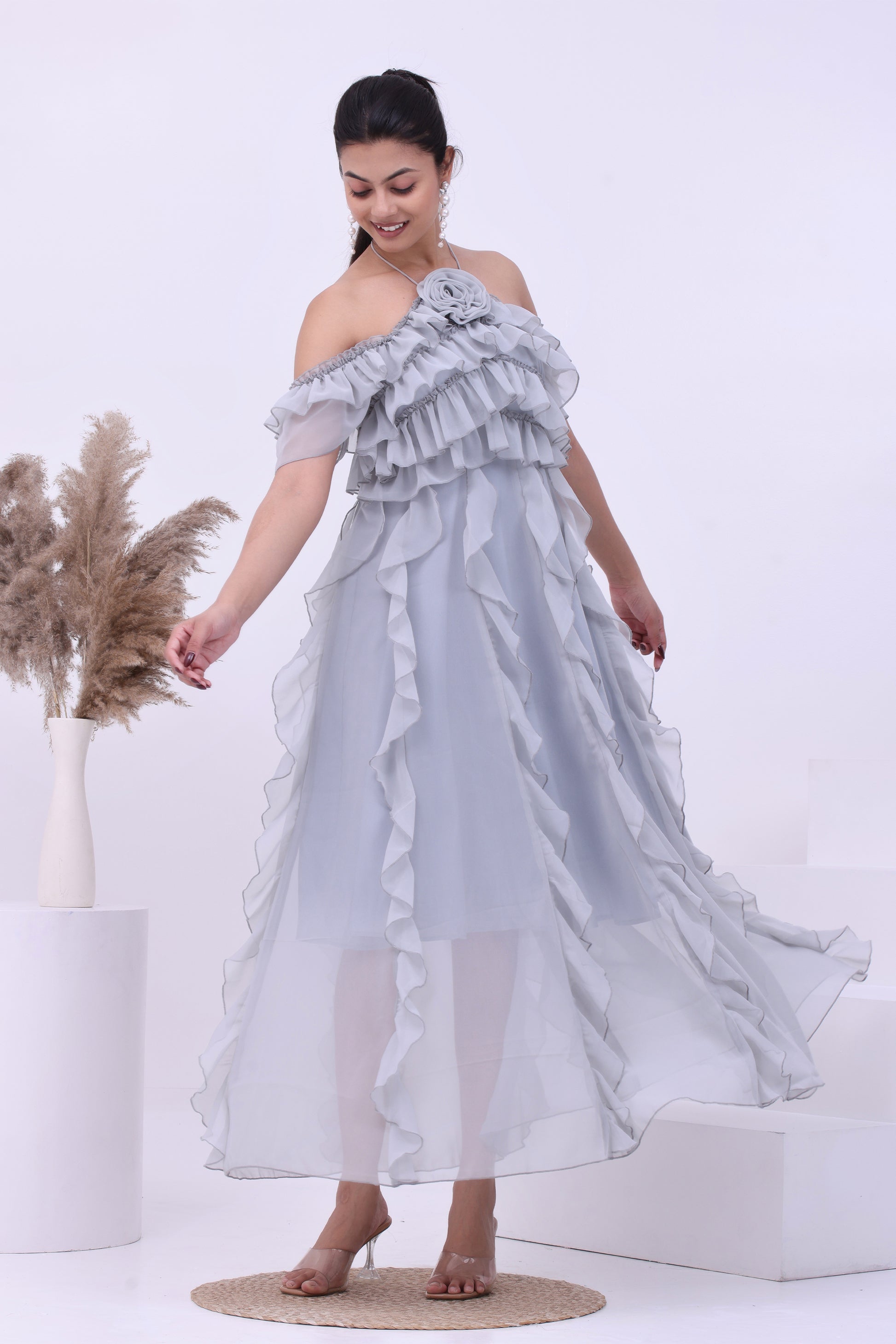 Float into elegance with our Frost Petal Ruffle Off-Shoulder Boho Maxi Dress ,a powder blue masterpiece that’s as graceful as it is glamorous. Crafted in airy georgette, this off-shoulder maxi dress features cascading ruffles throughout and a signature rosette detail at the neckline. Its tiered silhouette and light, flowy fabric create beautiful movement, making it perfect for pre-wedding events, cocktail parties, and resort-style evenings. Designed to flatter all body types with an effortless, feminine charm. Pair with dainty heels and statement earrings for a look that’s pure magic.