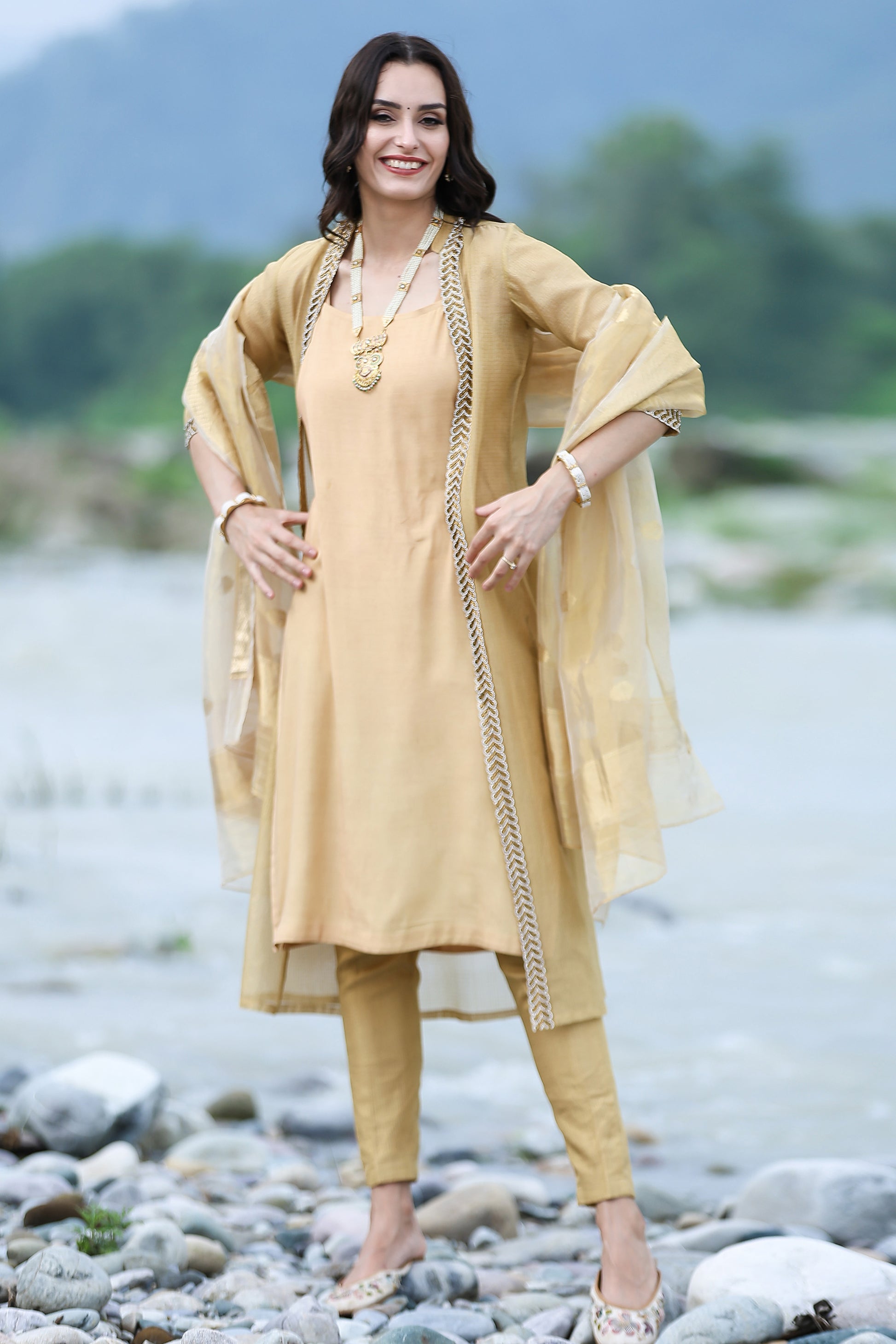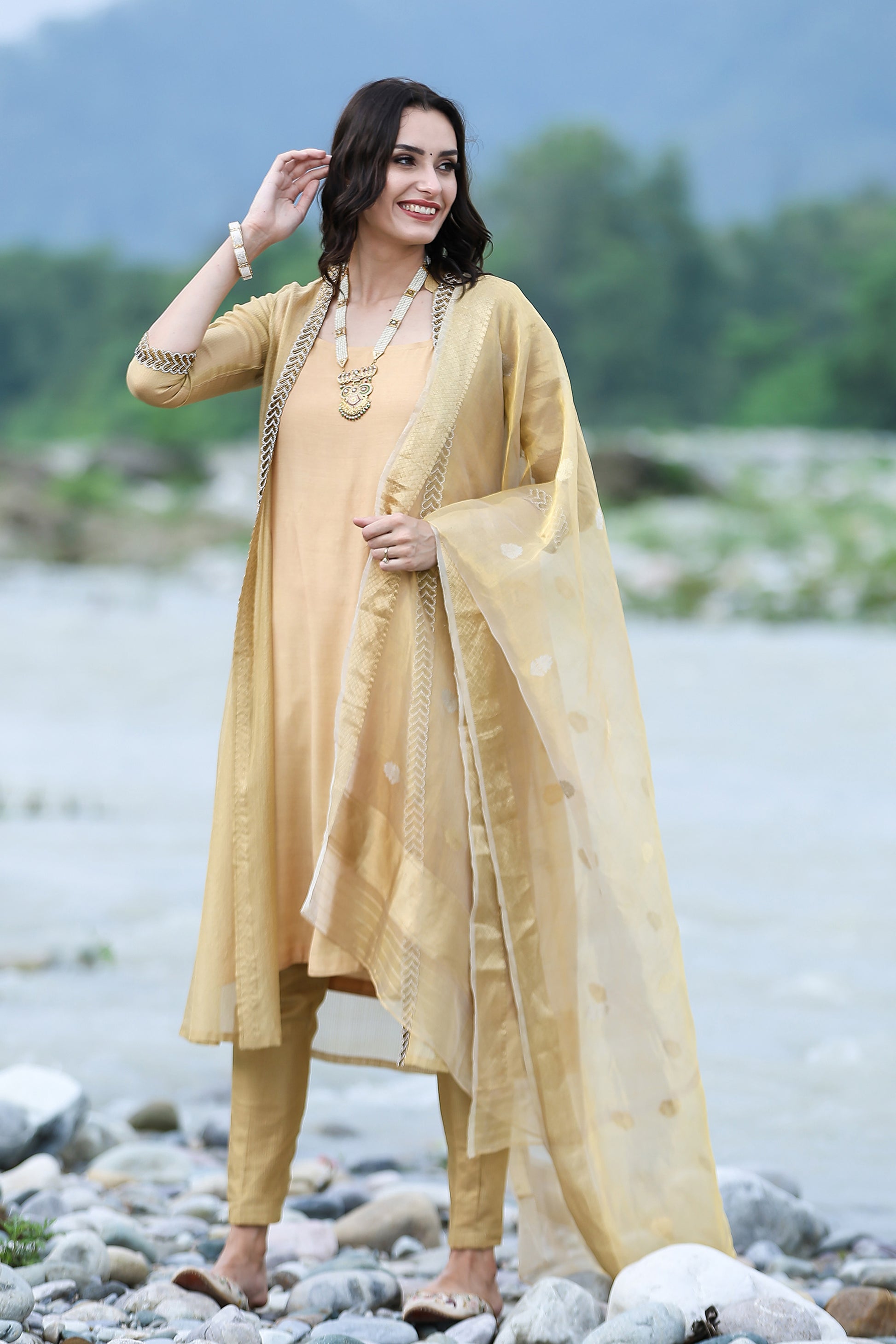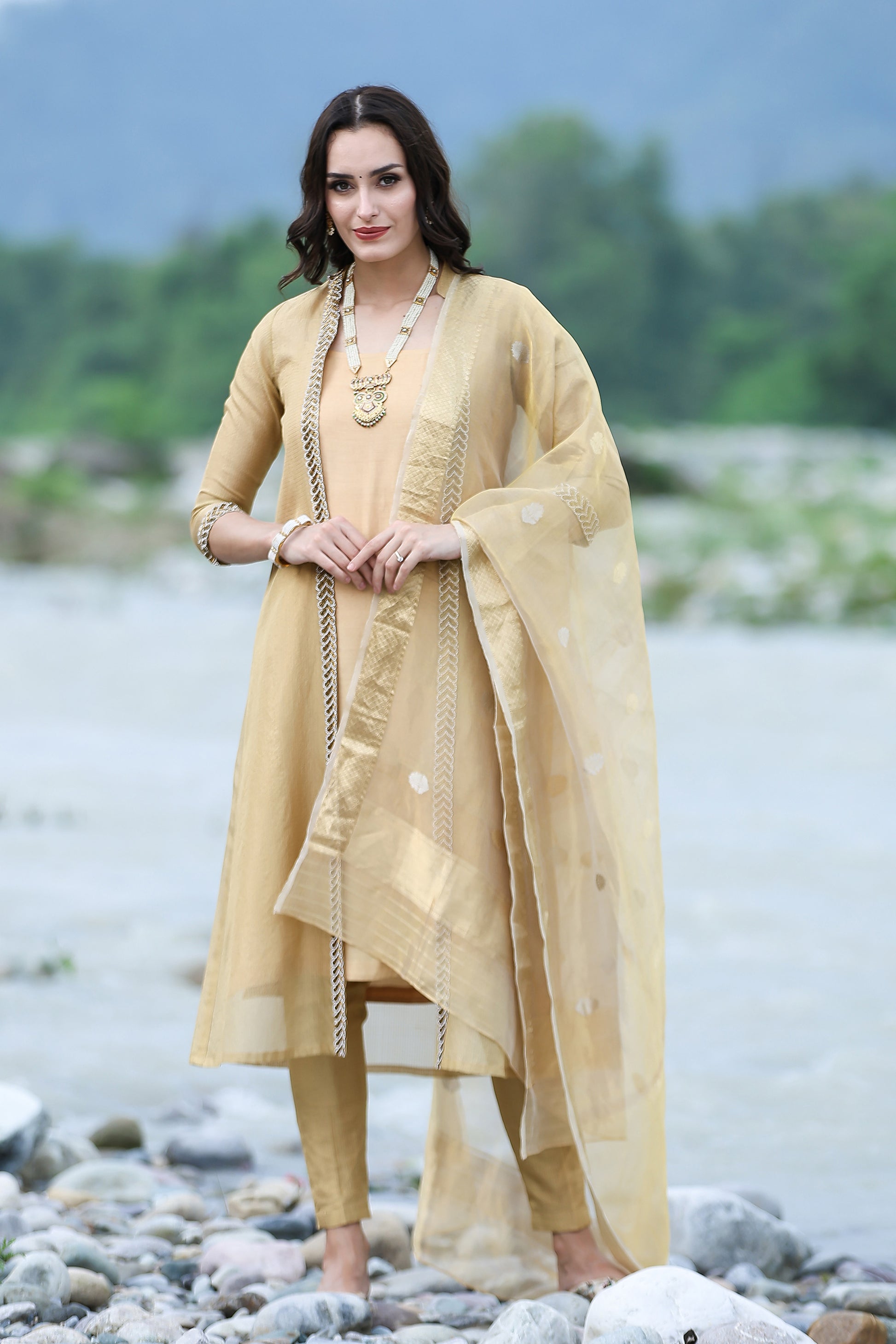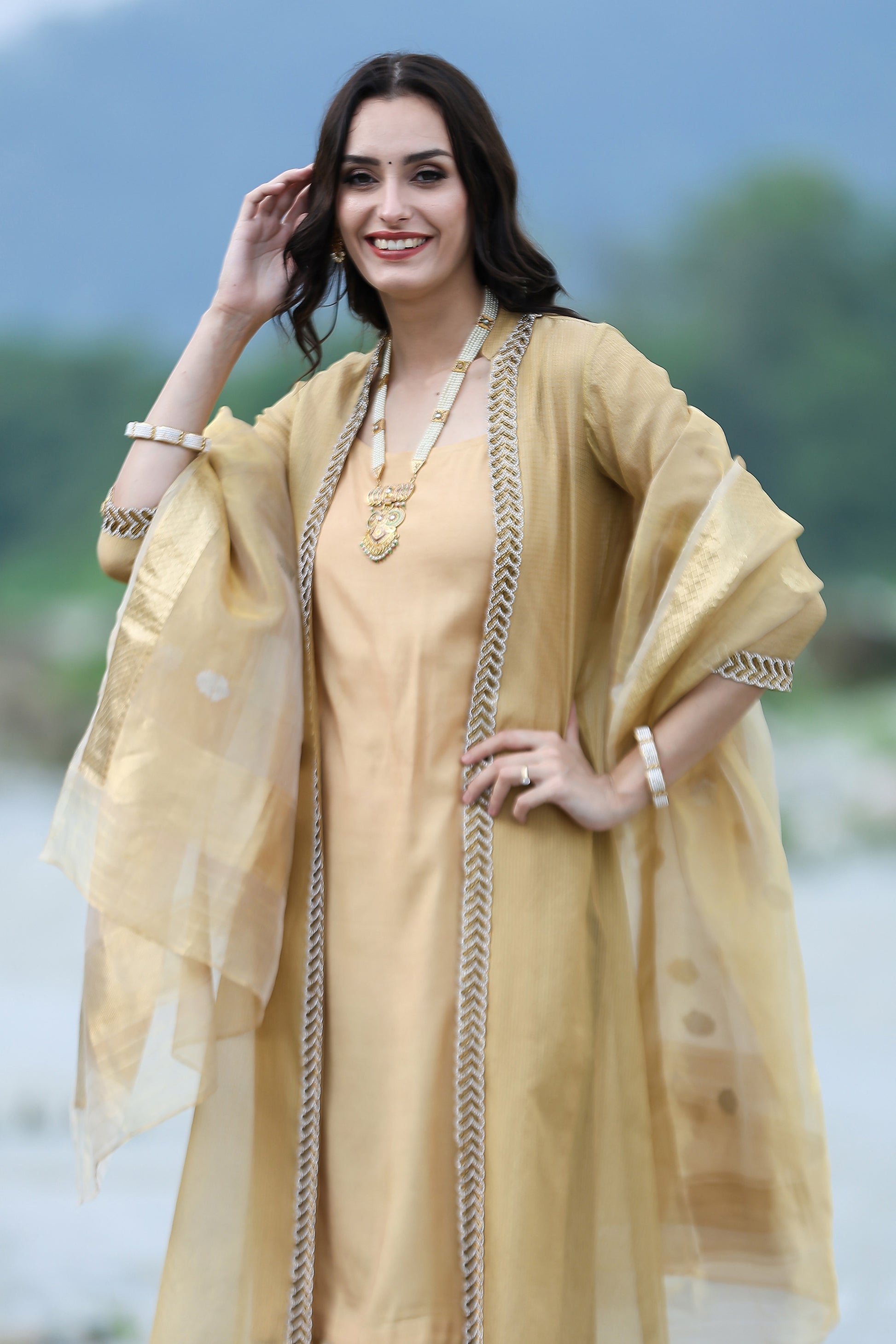 Epitome of grace, royalty and elegance featuring Banarasi Gold tissue Kota Handloom Sherwani Kurta with elbow length embellished sleeeves, detachable embellished sherwani jacket with mulmul adjustable camisole kurta, with comfortable and elasticated mulmul lined cigarette tissue pants. Our handloom tissue fabric gives a soft sheen that is combined with flowy feminine silhouette in this ensemble making it a perfect occasion and festive wear piece that radiates a glam goddess.