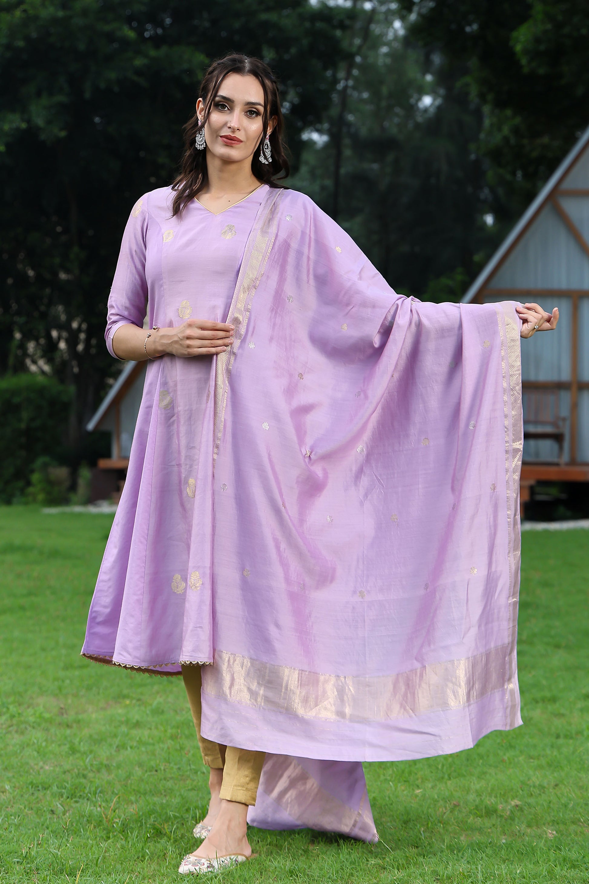 Epitome of grace, royalty and elegance featuring Lavender Banarasi Handloom Spun Silk Suit Set with zari embedded a-line kurta, spun silk duppatta, and cigar mulmul lined tissue pants