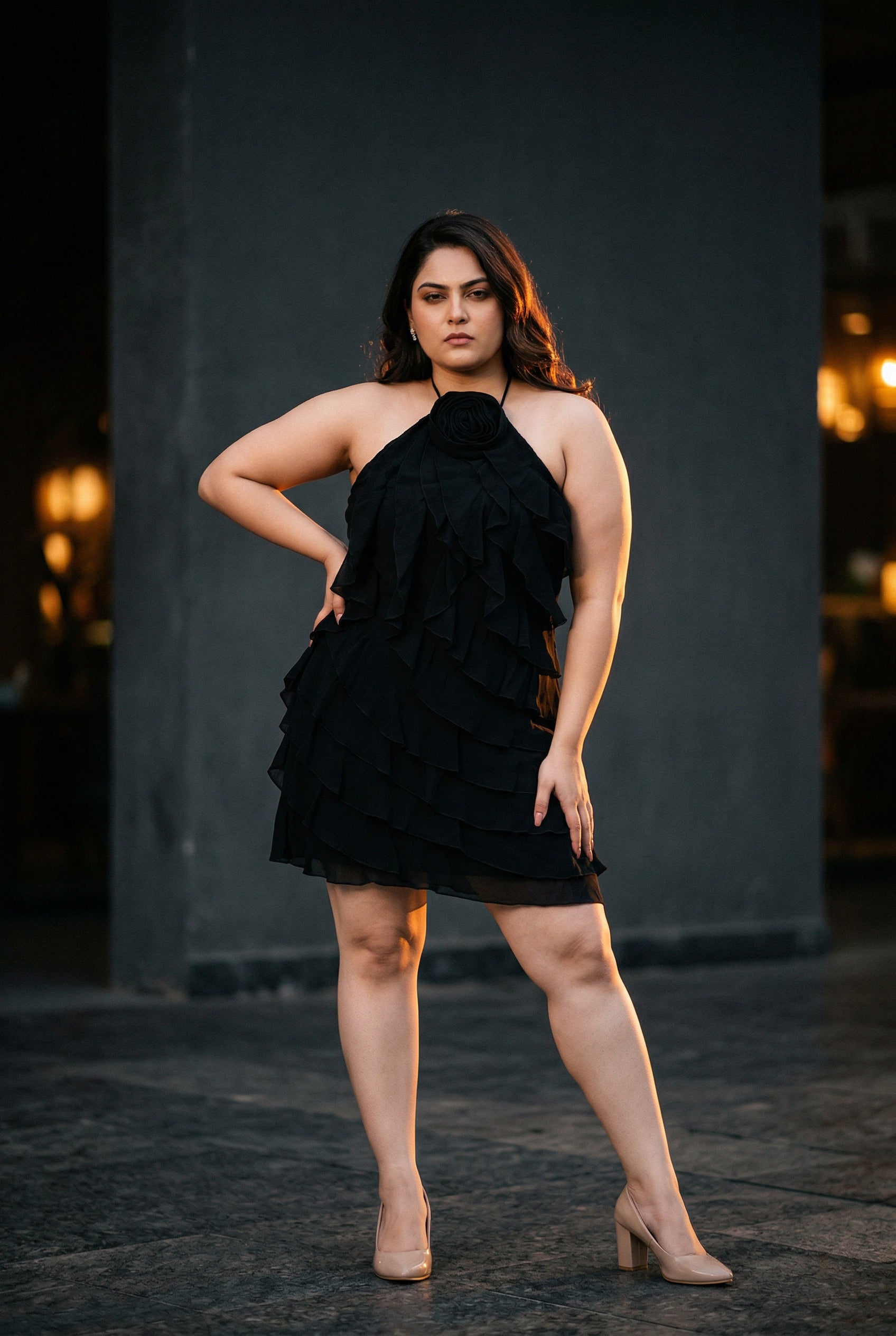 Introducing the Midnight Bloom Ruffle Dress – a modern take on the timeless little black dress. Featuring a flattering halter neckline with a rosette detail and layered ruffles that cascade effortlessly, this dress is made for confident, standout moments. Perfect for evening parties, cocktail events, and romantic dinners, it’s the ultimate wardrobe staple for those who love classic elegance with a bold edge.