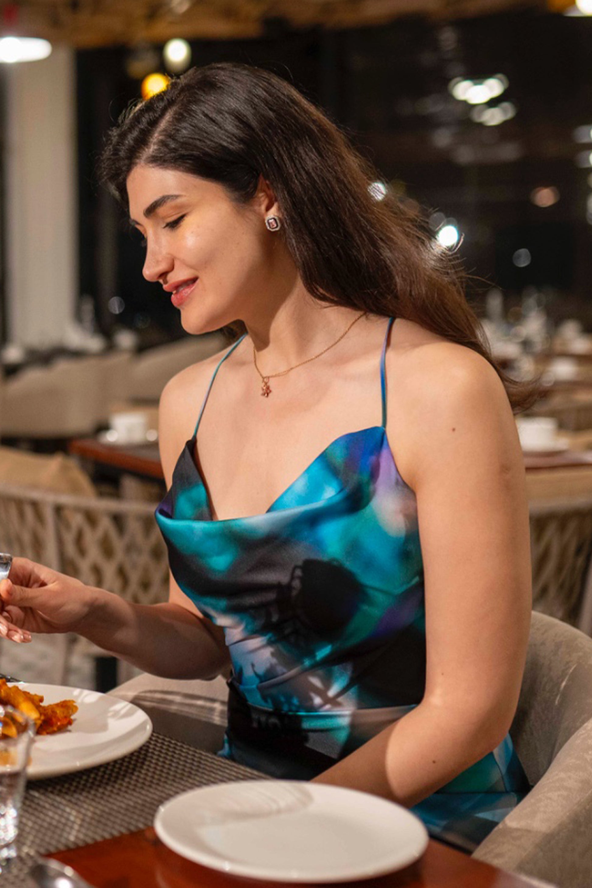 Indulge in elegance and allure with our Mystic Waters Cowl Neck Slip Dress. This midi-length slip dress is the epitome of sophistication, featuring a stylish cowl neck that adds a touch of glamour to your ensemble. Crafted from luxurious satin fabric, this dress drapes beautifully, offering a fluid and graceful silhouette that effortlessly skims your curves. The captivating print on this dress resembles a mesmerizing watercolor painting, blending shades of black, blue, and white with subtle hints of pink and purple. The artistic fusion of colors creates a dreamy and ethereal effect, making this dress a true statement piece. Whether you're preparing for a romantic date night or gearing up for a night out partying at the club, the "Mystic Waters" Printed Satin Slip Dress is your perfect companion. Embrace the enchanting beauty of this dress and make a lasting impression wherever you go.
