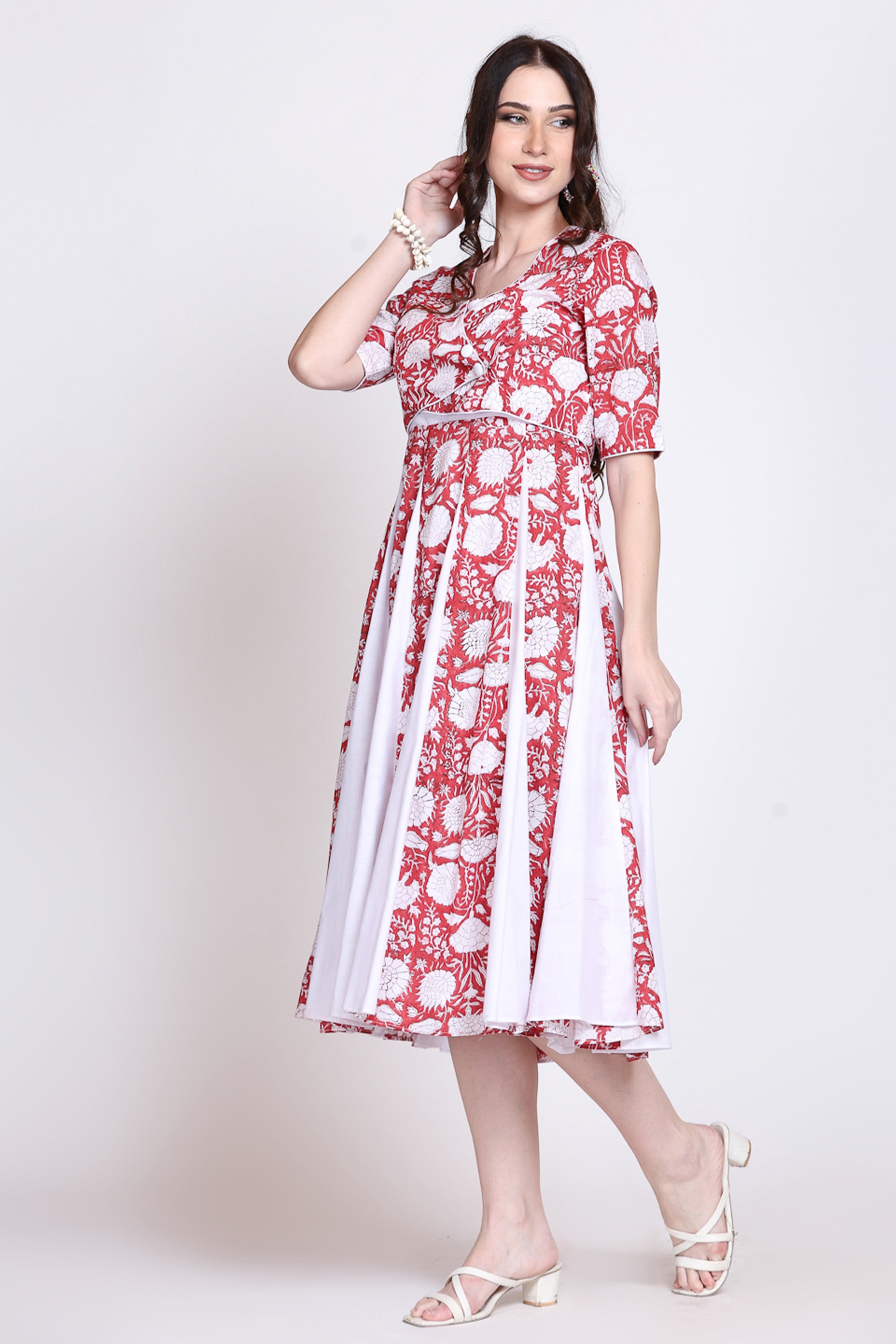 A Cotton Handblock printed floral dress with panelled silhouette, midi length and adjustable sleeve straps, paired with a detachable shrug. Comfortable yet stylish fit can be work with or without shrug to create a chic look.