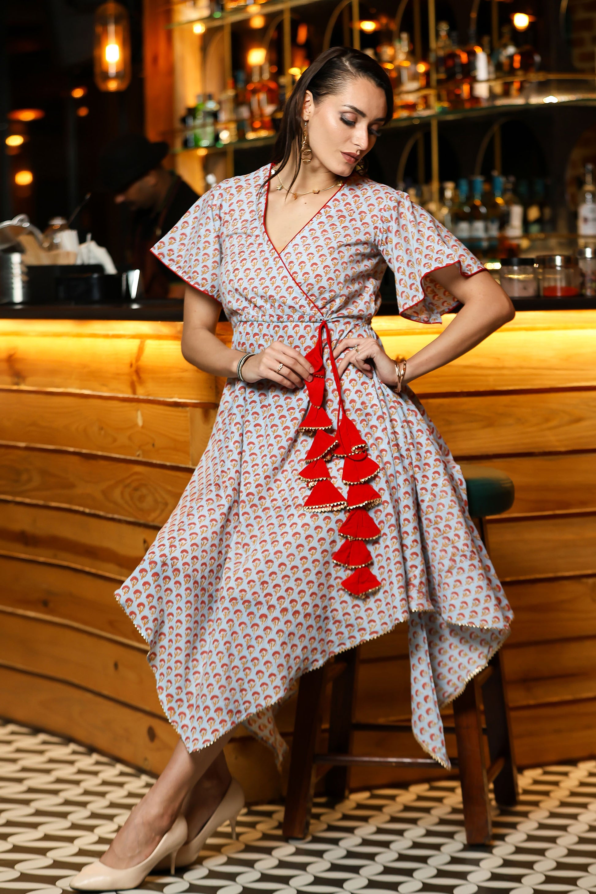 Made from soft and breathable hand block printed Sanganeri cotton fabric this Handkerchief dress features a v- neck, bell sleeves, drawstring adjustable at bust and festive red tassels with lace detailing in sleeves and hem . Asymetrical silouette of this dress with ethnic elements is a perfect fusion to create a timeless indoethnic piece.