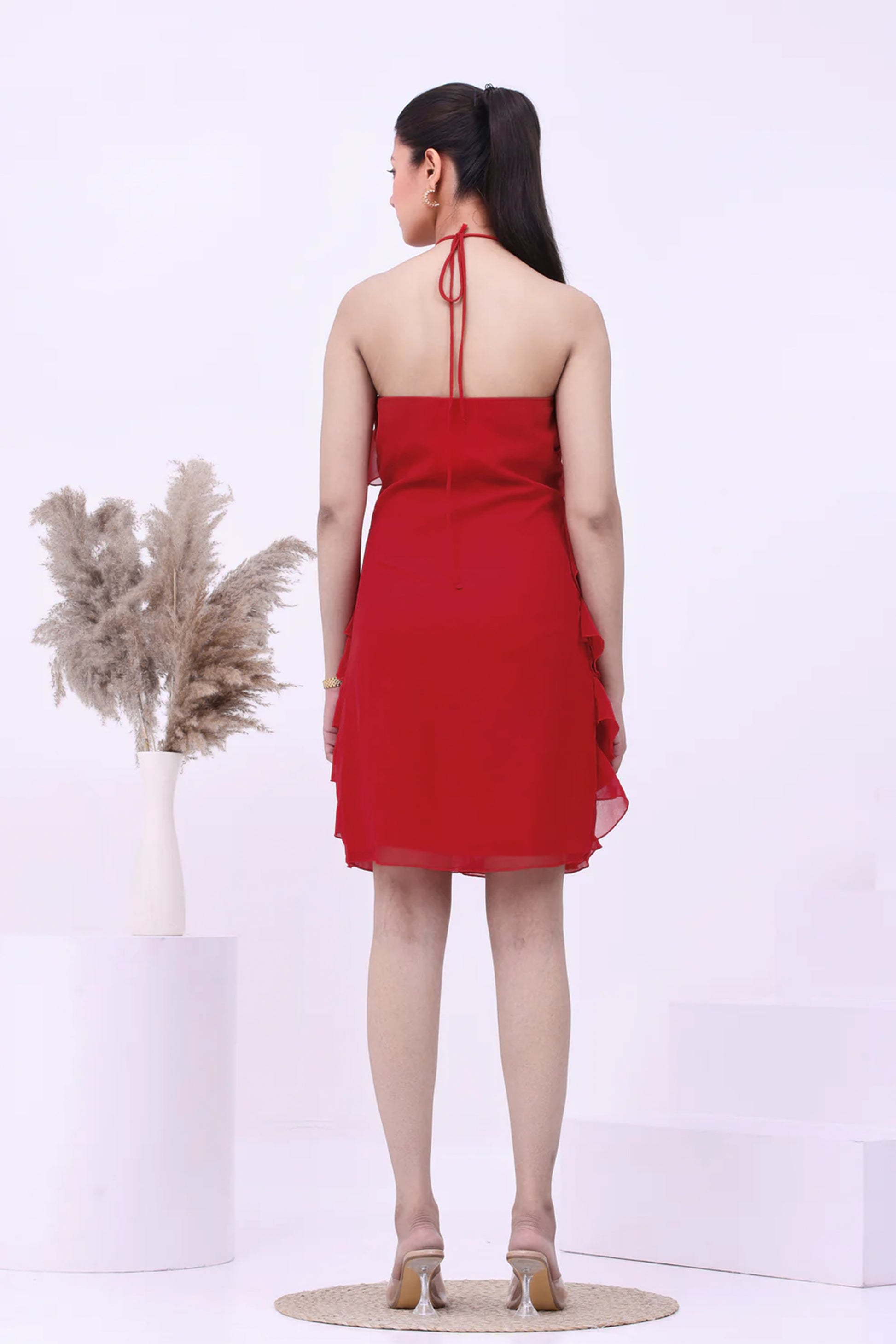 Capture hearts and turn heads in our Scarlet Bloom Ruffle Dress .. This stunning short-length dress is designed to make you stand out in style. The halter neck accentuates your shoulders and back, adding a touch of allure to your look. Adorned with a delicate flower detail at the neck, this dress exudes femininity and charm. Crafted from luxurious chiffon fabric, the dress features vertical ruffles all over, creating a dynamic and eye-catching texture that is sure to make a statement. The vibrant red color radiates confidence and allure, making it perfect for a romantic date night, a special occasion, a cocktail party, or a night out with friends. Additionally, it transitions seamlessly for a stylish and elegant brunch ensemble.
