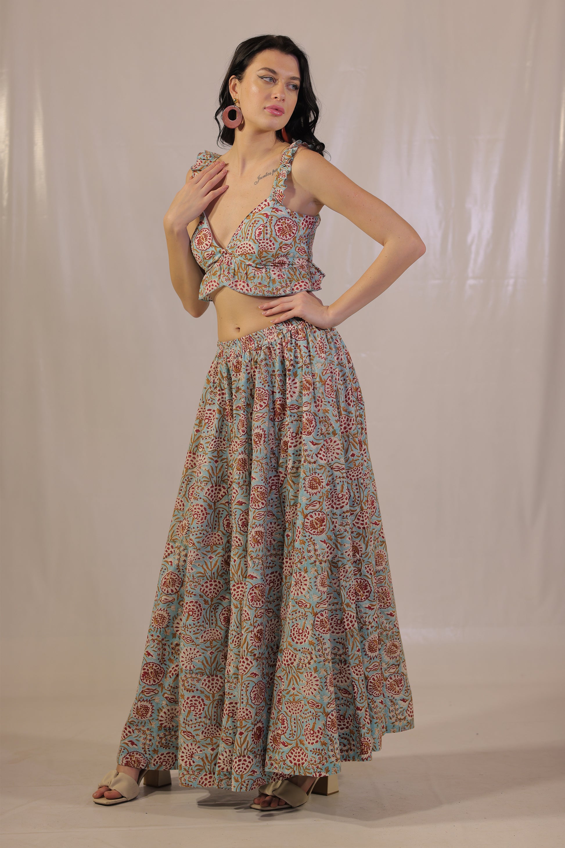 Sea Breeze Blockprinted Ruffels Blouse is made with soft handblockprinted fabric with mulmul lining making it a perfect breezy fit for summers , It is padded at bust and has a ruched back for great fitting . You can pair this with our Sea Breeze Blockprinted Skirt , drape an elegant saree or wear it as a crop top .